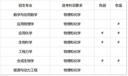我校招生專業包括數學與應用數學、應用物理學、應用化學、生物科學、工程力學、合成生物學、能源與動力工程。所有招生專業在非高考改革省份招收理科考生,在高考改革省份選考科目要求見下表: