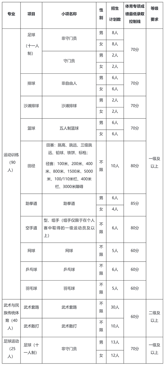 1.運動訓練專業招生項目:足球(十一人制)、排球(非自由人)、籃球(五人制)、跆拳道、空手道、田徑、乒乓球、羽毛球、網球、沙灘排球。