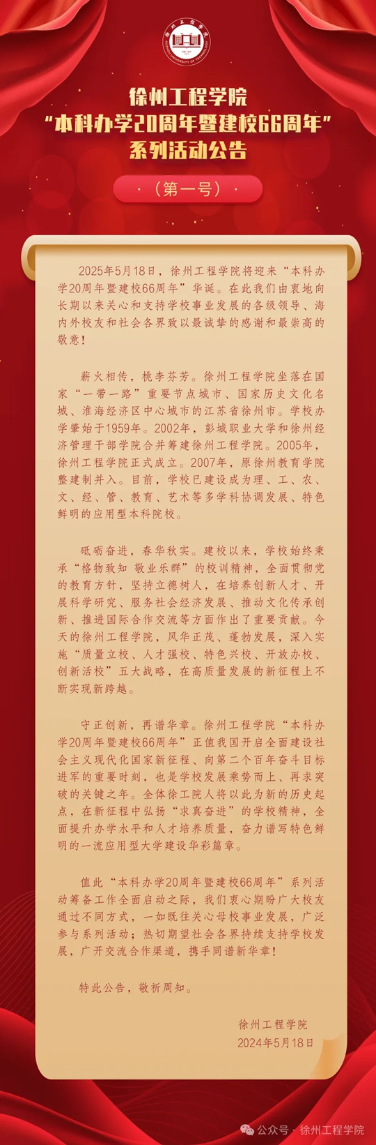 徐州工程學(xué)院“本科辦學(xué)20周年暨建校66周年”系列活動(dòng)一號(hào)公告