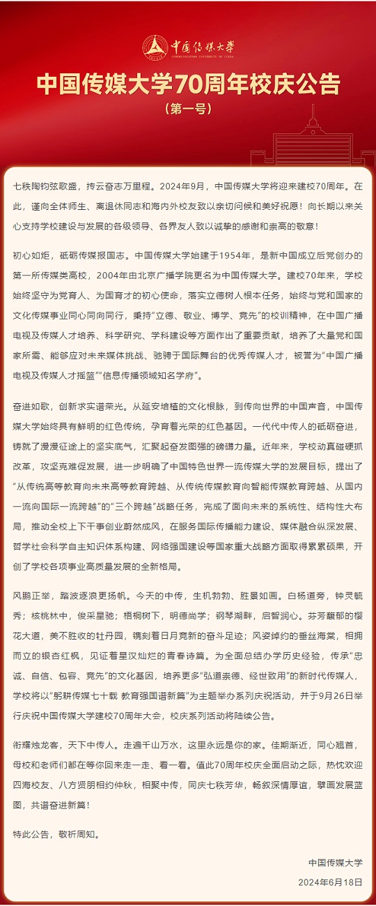 中國(guó)傳媒大學(xué)70周年校慶公告(第一號(hào))