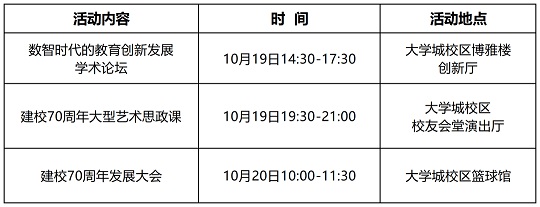 今年10月20日是重慶師范大學建校70周年紀念日,學校將舉行院士(專家)學術報告會等系列重要慶祝活動。值此校慶日倒計時一月之際,特對校慶期間重要活動公告如下:
