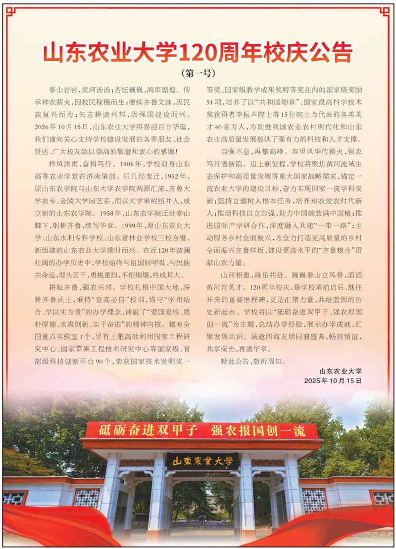 山東農業大學120周年校慶公告(第一號)