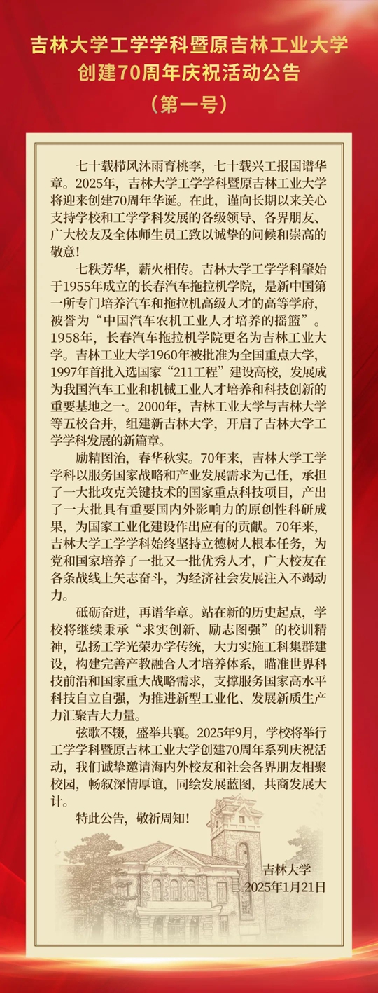 吉林大學工學學科暨原吉林工業大學創建70周年慶祝活動公告(第一號)