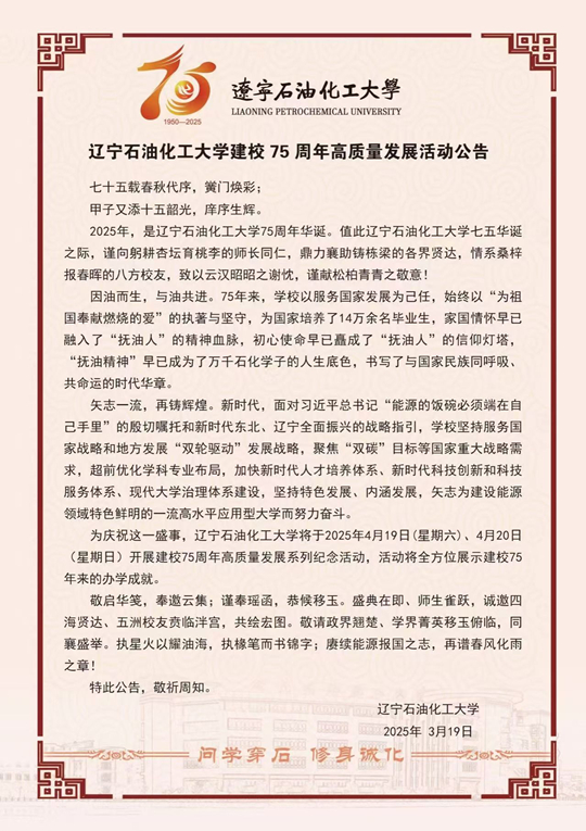 遼寧石油化工大學建校75周年高質量發展活動公告