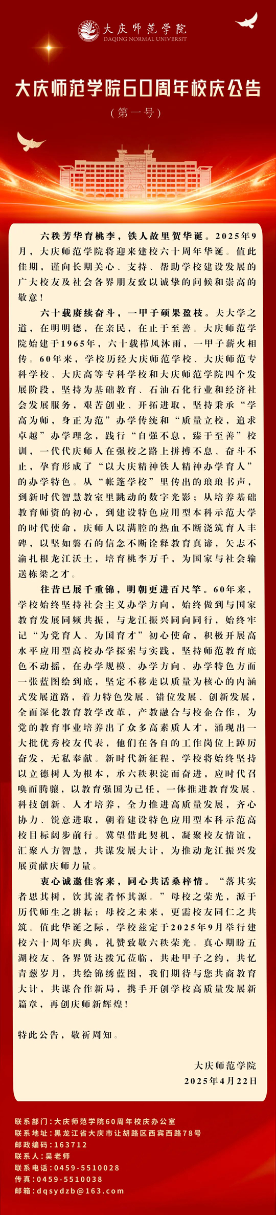 大慶師范學院60周年校慶公告(第一號)