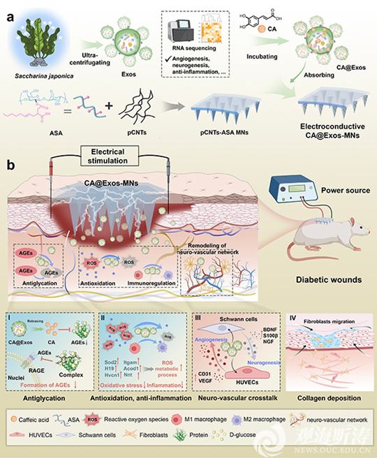 研究團隊構建了一種新型生物-電療法平臺,通過將咖啡酸工程化的海帶(Saccharina japonica)外泌體(CA@Exos)物理吸附到導電瓊脂糖微針針尖中,利用CA@Exos產(chǎn)生的生物信號與導電微針傳遞的電信號協(xié)同作用,重塑糖尿病創(chuàng)面的神經(jīng)-血管微環(huán)境。應用于糖尿病傷口后,CA@Exos能抑制AGEs生成、清除活性氧并改善炎癥,同時激活血管生成和神經(jīng)再生信號通路,增強雪旺細胞與血管內(nèi)皮細胞間的串擾。導電微針不僅實現(xiàn)了外泌體的皮膚深層組織遞送,還作為時空可控的生物電支架,通過傳遞電刺激信號以促進外泌體攝取并放大內(nèi)源性傷口電流。該雙模式策略協(xié)同加速血管新生、神經(jīng)再生與再上皮化,從而加速糖尿病大鼠全層創(chuàng)面愈合。研究團隊將海洋生物來源的外泌體與導電微針有機結合,不僅拓展了海洋活性物質(zhì)在再生醫(yī)學中的應用,也展示了生物信號與物理刺激信號協(xié)同調(diào)控微環(huán)境的新思路,為臨床解決糖尿病慢性創(chuàng)面這一重大難題提供了潛在的轉(zhuǎn)化應用方案。