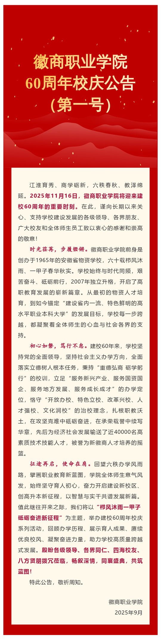徽商職業學院60周年校慶公告(第一號)