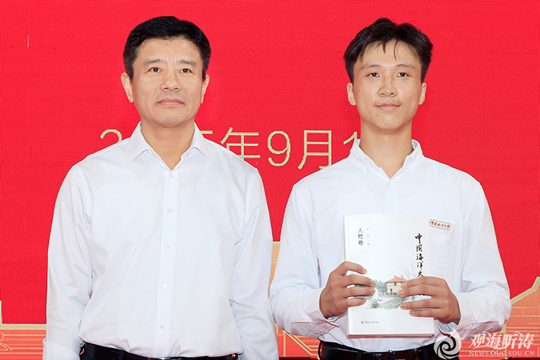 李明書記為新生代表佩戴;,并頒贈《中國海洋大學史·人物卷》