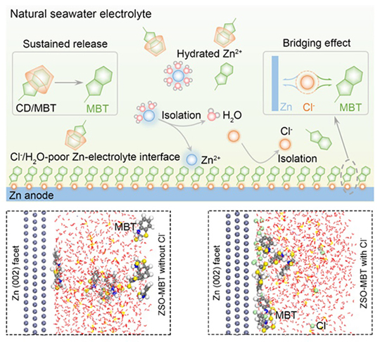 海水鋅離子電池可為海洋監(jiān)測、深海裝備及沿海可再生能源儲存提供直接、安全的能源供給,在海洋應(yīng)用中具有獨(dú)特優(yōu)勢。然而海水電池中富氯/水的負(fù)極-電解液界面,給鋅金屬負(fù)極帶來嚴(yán)重的腐蝕挑戰(zhàn)。針對此挑戰(zhàn),研究團(tuán)隊(duì)設(shè)計(jì)了一種含有主客體復(fù)合物添加劑的海水電解液。該電解液以2-巰基苯并噻唑(MBT)作為客體分子,借助環(huán)糊精(CD)主體實(shí)現(xiàn)緩釋控制,有效調(diào)控其在電解液中的含量。氯離子通過橋接效應(yīng)在電極界面構(gòu)筑出致密的MBT屏障,形成貧氯/貧水的局部微環(huán)境,顯著抑制了鋅負(fù)極的腐蝕行為,延長其循環(huán)壽命。實(shí)驗(yàn)表明,鋅負(fù)極在實(shí)際放電深度42.7%的條件下實(shí)現(xiàn)了400小時以上的穩(wěn)定循環(huán);N/P比為1.92的全電池經(jīng)歷600次循環(huán)后仍保持99%的容量,安時級軟包電池初始放電容量達(dá)1.21Ah,并可穩(wěn)定循環(huán)50圈。該研究為發(fā)展低成本、實(shí)用型海水鋅離子電池提供了新思路。相關(guān)論文以“Chloride-Bridged Compact Interfacial Shielding for Practical Seawater Zinc Batteries”(氯橋接致密界面屏蔽實(shí)現(xiàn)實(shí)用型海水鋅電池)為題發(fā)表于《德國應(yīng)用化學(xué)》,并被評選為“Very Important Paper”,該論文的第一作者是材料科學(xué)與工程學(xué)院2022級博士生范文杰。