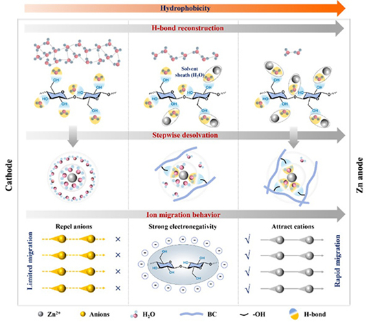 課題組還開發(fā)出一種厚度僅18μm的疏水梯度纖維素隔膜。該隔膜借助疏水梯度結(jié)構(gòu)與表面負(fù)電荷的協(xié)同作用,有效阻隔氯離子滲透并降低界面水活性,不僅為水合鋅離子構(gòu)建了逐步脫溶路徑,促進(jìn)高聚集態(tài)電解質(zhì)的形成以抑制副反應(yīng),還通過靜電屏蔽效應(yīng)排斥氯離子、均化鋅沉積,進(jìn)一步提升了電池的循環(huán)穩(wěn)定性。采用該隔膜的鋅負(fù)極在天然海水電解液中實(shí)現(xiàn)了2900小時的長循環(huán)壽命,在50%放電深度下穩(wěn)定運(yùn)行1300小時,所組裝的全電池體積能量密度達(dá)233.1 Wh L⁻¹(N/P=2.3)。該隔膜技術(shù)為海上儲能系統(tǒng)提供了關(guān)鍵材料支撐。相關(guān)成果以“Hydrophobicity Gradient in Ultrathin Cellulose Separators for Durable Seawater-Based Zinc Batteries”(超薄疏水梯度纖維素隔膜實(shí)現(xiàn)長效海水鋅電池)為題發(fā)表于《先進(jìn)功能材料》,該論文的第一作者是材料科學(xué)與工程學(xué)院2023級博士生董艷瑩。