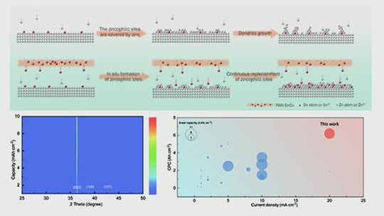 此外,課題組提出了一種動態(tài)界面合金化策略,通過可控離子釋放實(shí)現(xiàn)自適應(yīng)界面調(diào)控。該策略采用氯化亞錫和聚丙烯腈靜電紡絲復(fù)合界面膜,逐步釋放亞錫離子并在負(fù)極表面原位還原形成金屬錫。后續(xù)的鋅沉積促使持續(xù)形成鋅-錫合金,不斷補(bǔ)充親鋅位點(diǎn),誘導(dǎo)Zn(002)面外延生長。該合金化界面還可加速亞錫離子在局部缺陷區(qū)域的還原,引導(dǎo)鋅優(yōu)先沉積,修復(fù)結(jié)構(gòu)完整性,從而顯著提升負(fù)極的可逆性與穩(wěn)定性。基于該策略的電池可實(shí)現(xiàn)3.5 mAh cm-2的面容量,穩(wěn)定循環(huán)超過1000次。相關(guān)研究以“Dynamic Interfacial Alloying for Highly Reversible Zinc Anodes”(動態(tài)界面合金化構(gòu)筑高可逆鋅負(fù)極)為題發(fā)表于《先進(jìn)功能材料》,該論文的第一作者是材料科學(xué)與工程學(xué)院2023級博士生王興杰。