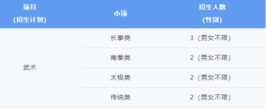 2025年計(jì)劃招收武術(shù)項(xiàng)目共計(jì)9人,具體招生人數(shù)如下: