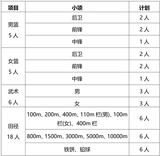 田徑、籃球、武術(套路),共計招收34人。其中,田徑限以下小項:100m、200m、400m、110m欄(男)、100m欄(女)、400m欄、800m、1500m、3000m、5000m、10000m、鐵餅、鉛球。