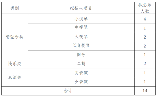 我校2023年高水平藝術團招生計劃為7人,擬認定資格考生不超過14人,各招生項目及擬認定資格人數如下:
