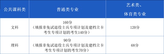填報非免試退役士兵專項計劃和建檔立卡考生專項計劃中藝術類、體育類專業的考生,其公共課合格線按照低線執行(即文科120分,理科68分)。