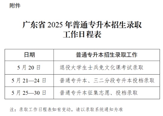 我省普通專升本招生錄取工作(含三二分段轉段考核、退役大學生士兵免文化課考試,下同)將于5月20日至30日進行。為做好廣東省2025年普通高等學校專升本招生錄取工作,現將有關事項通知如下。
