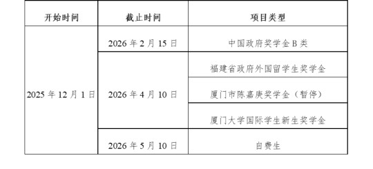 2.中國政府獎學金A類、國際中文教師獎學金等項目無須在“廈門大學境外學生申請系統(tǒng)”報名,其申請時間以教育部中外語言交流合作中心、國家留學基金委(含中國駐外大使館等受理機構)公布的為準。