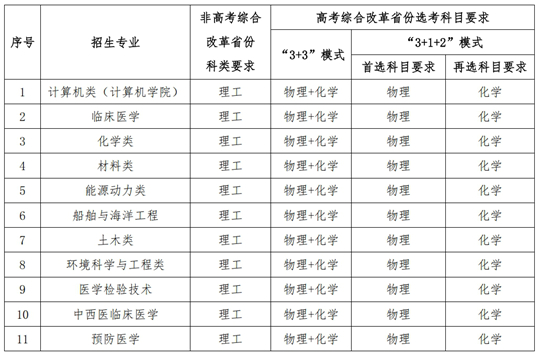 高校專項計劃招生160人,招生專業為計算機類(計算機學院)、臨床醫學、化學類、材料類、能源動力類、船舶與海洋工程、土木類、環境科學與工程類、醫學檢驗技術、中西醫臨床醫學、預防醫學。我校將根據各省份入圍資格學生人數,確定具體的分省分專業招生來源計劃,并通過學校本科招生信息網公布。