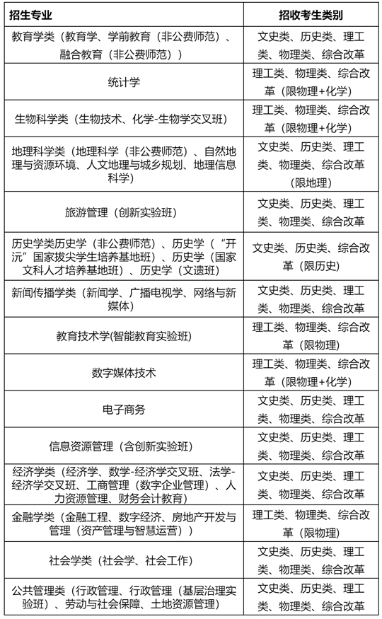 備注:1.非高考綜合改革省份考生在系統報名時選擇文史類或理工類;實行“3+1+2”模式高考綜合改革省份考生選擇歷史類或物理類;實行“3+3”模式高考綜合改革省份考生在系統報名時選擇綜合改革類;在高考填報志愿時再填報具體專業(類)。2.我校最終在各省(市、區)的招生專業以教育部批準的2025年分省分專業招生來源計劃為準。3.我校高校專項計劃不招收新疆雙語類考生。