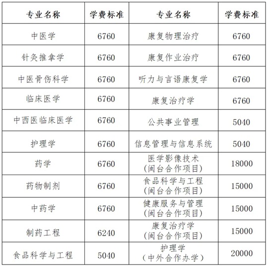根據閩中醫函〔2023〕67號、閩中醫函〔2021〕68號、閩發價格函〔2019〕32號、閩價費〔2015〕288號等文件規定,學校普通本科各專業的學費收費標準如下表:(單位:元/學年)