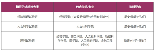 。ㄒ唬┙(jīng)濟(jì)管理試驗(yàn)班:首選科目為歷史或物理,再選科目不限。大一結(jié)束時學(xué)生可在經(jīng)管學(xué)院的所有專業(yè)內(nèi)(大數(shù)據(jù)管理與應(yīng)用專業(yè)除外)選定主修專業(yè);