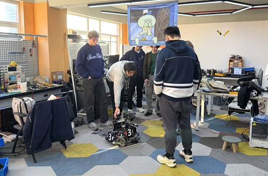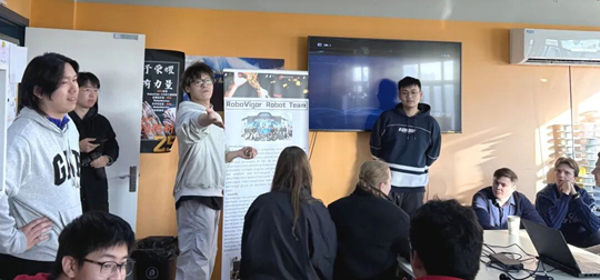 之后,參訪隊伍來到位于教學(xué)樓四樓的創(chuàng)新領(lǐng)導(dǎo)力中心——“RoboVigor”機器人賽隊活動室。國際生們受到賽隊成員與指導(dǎo)老師的熱情接待。一進門,同學(xué)們便被眼前豐富的器材與設(shè)備所震撼。負責(zé)項目管理的陳淇同學(xué)首先為同學(xué)們介紹了賽隊概況:賽隊分為四個小組,機械組負責(zé)機械設(shè)計、制造與調(diào)試;算法組負責(zé)編程、算法優(yōu)化與人工智能;電控組負責(zé)電子電路設(shè)計、電機驅(qū)動與控制;而他所在的運營組則負責(zé)團隊財務(wù)管理、活動策劃與宣傳推廣等工作。