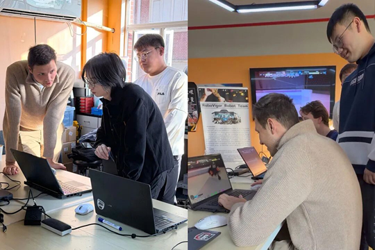 介紹完畢,陳淇引導(dǎo)同學(xué)們來到活動室中央,一場別開生面的機器人互動體驗隨即展開。國際生們興致勃勃地拿起遙控器,親身體驗操控RoboVigor自主研發(fā)的機器人。隊長周瓊為同學(xué)們簡明精要地介紹了機器人的設(shè)計與原理,其精妙的結(jié)構(gòu)與靈活的表現(xiàn)令大家贊嘆連連。緊接著,電控組組員劉睿哲介紹了賽隊參與的各項賽事及比賽規(guī)則,并圍繞實戰(zhàn)經(jīng)驗與備賽策略,與國際生們展開了熱烈交流。而在另一邊,機械組組長畢宗洋邀請同學(xué)們坐到電腦前,體驗機器人競賽全真模擬軟件,國際生們化身機器人操縱師,在模擬場地中大顯身手。