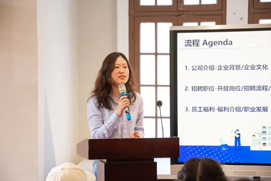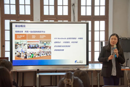萬耀企龍人力資源總監張若旻首先以公司發展歷程為切入點,詳細介紹了萬耀企龍的四類核心展會活動,如亞寵展、米蘭國際家具展以及VIV國際畜牧展等。她還介紹了公司全球化戰略及人才培養體系,重點推介了面向商科學生的市場策劃、項目運營等崗位的招聘計劃以及福利待遇。她表示,公司尤為重視員工的創新能力和實踐精神,鼓勵同學們在實習中積累經驗、展現潛力。