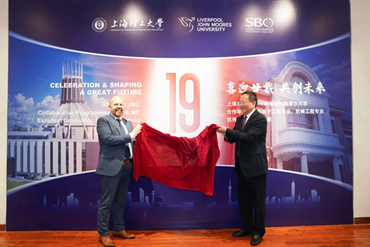 活動中,校長朱新遠和倪克·斯莫共同為紀念兩校合作辦學19周年的展板揭幕。展板上的數字“19”象征著雙方19載中外合作辦學的輝煌歷程,也代表著19年來兩校共同書寫下的教育合作佳話!9”與漢語“久”同音,寓意著上海市與利物浦市、上海理工大學與利物浦約翰摩爾大學的合作將源遠流長、歷久彌堅。雙方堅信,在即將到來的下一個19年里,攜手合作定能邁向新的高度,收獲更多碩果。