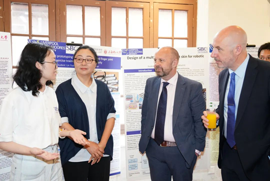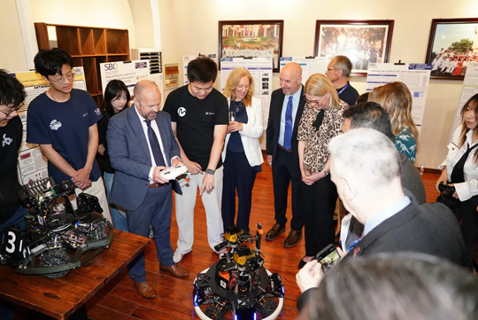在互動交流環節,中英國際學院工程與計算學院的師生們展示了精心挑選的優秀工科專業畢業設計海報,這些海報主題新穎、創意十足。學院兩個工科專業的學生們向倪克·斯莫一行詳細介紹了畢業設計情況和學習成果。RoboVigor機器人學生賽隊演示了賽隊自主組裝、研發的機器人,并介紹了賽隊成長歷程和所獲榮譽。倪克·斯莫一行對中英國際學院充分利用國際化教育資源優勢,培養出一批掌握扎實工科專業知識且具備國際視野、創新意識、實踐能力和跨文化溝通能力的復合型工程人才給予了高度肯定。