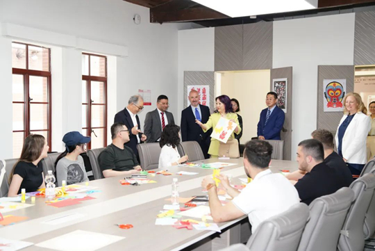 利物浦約翰摩爾大學國際部主任、利物浦中國合作組織副主席王懿博士,工程學院院長克里斯蒂安·馬修(Christian Matthews)博士,工程技術學部外事副主任羅賓·派恩(Robyn Pyne)博士,在中英國際學院班子成員的陪同下參觀復興路校區校史館,與正在體驗中國剪紙的、參加學院2025年國際夏校的利物浦約翰摩爾大學學生交流。
