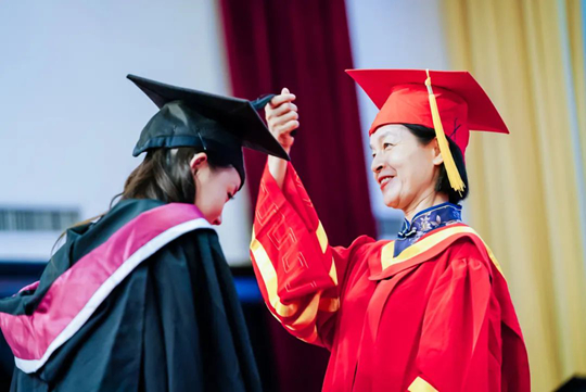 學位授予儀式上,中英國際學院黨委副書記、副院長(主持行政工作)、代理執行院長張崢宣讀畢業生名單。中英雙方院校領導為畢業生撥穗正冠、握手勉勵,并與畢業生合影留念。